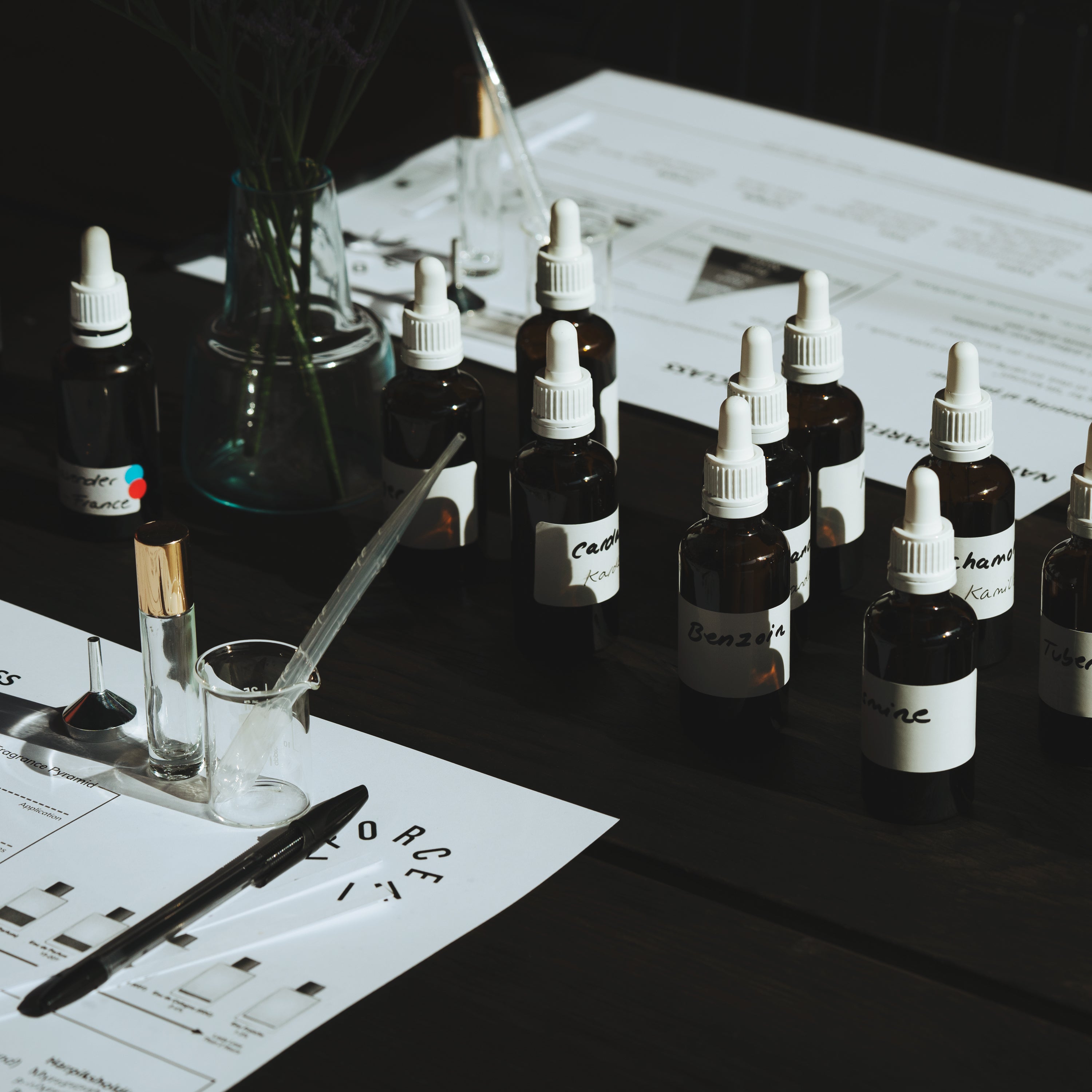 Step one begins with sensory immersion. You'll be blindfolded, heightening your olfactory senses as you explore a curated selection of exquisite all-natural premium ingredients. As you inhale each scent, we'll engage in a dialogue, uncovering the essence of your scented memories and what you seek in your signature scent.